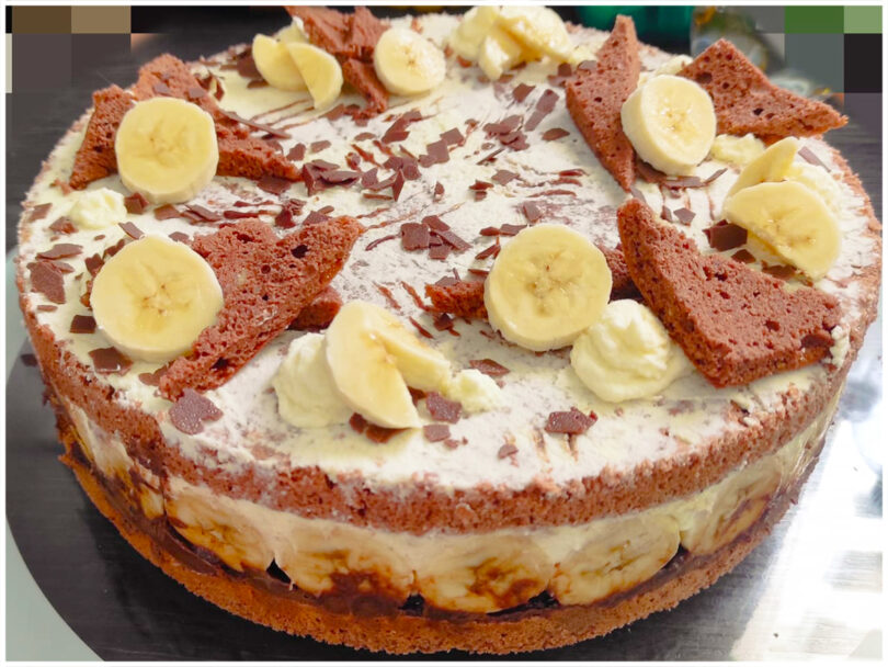 - Restliche Sahne steif schlagen und auf Torte verteilen. Mit Sahnetupfen, Bananenscheiben, Nuss-Nougat-Creme und Schokoladensplittern dekorieren. Gekühlt servieren und bis zu 3 Tage aufbewahren.
