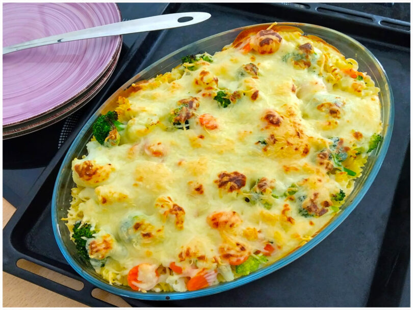 - Die gekochten Nudeln, das Hähnchen, den Brokkoli und die Möhren in eine Auflaufform geben und gut vermischen.