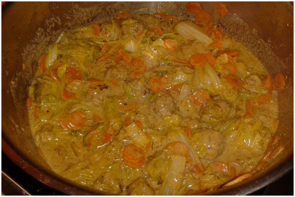 Kohl putzen, waschen und in breite Streifen schneiden. Öl in einer Pfanne erhitzen und die Hackbällchen darin ca. 5 Min braten. Dann die Hackbällchen herausnehmen und Kohl und Möhren im Bratenfett andünsten, dann 1/8 L Wasser und Creme fraiche dazugeben und gar kochen. Hackklößchen zufügen die Mehlschwitze einrühren und aufkochen. Mit Salz und Pfeffer abschmecken.