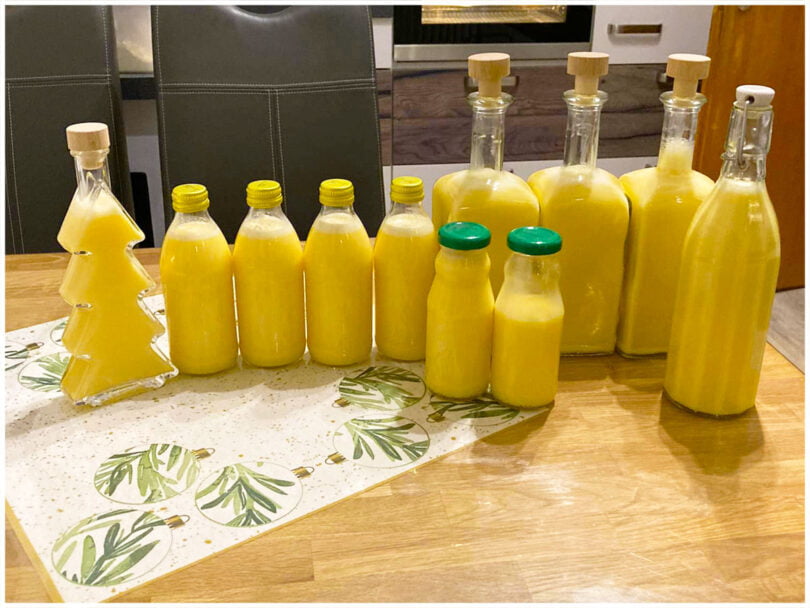 9. Abfüllen: Gießen Sie den fertigen Eierlikör in saubere Flaschen und verschließen Sie sie fest. Lagern Sie den Likör im Kühlschrank, um ihn kühl und frisch zu halten.