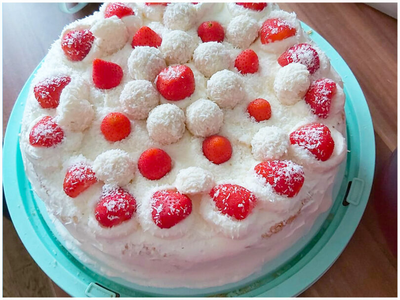 - Schlagen Sie 600 g Sahne steif. Füllen Sie etwas mehr als ein Drittel in einen Spritzbeutel mit großer Sterntülle. Bestreichen Sie die Torte mit der restlichen Sahne und spritzen Sie Sahnetuffs darauf. Halbieren Sie die Raffaello. Verzieren Sie die Torte mit den übrigen Erdbeeren und den halbierten Raffaello. Kühlen Sie sie vor dem Servieren gut durch.