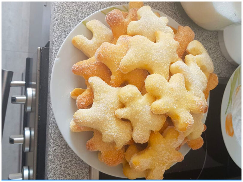 - Die Quarkhasen leicht abkühlen lassen, erneut mit Margarine bestreichen und in Zucker wälzen.
