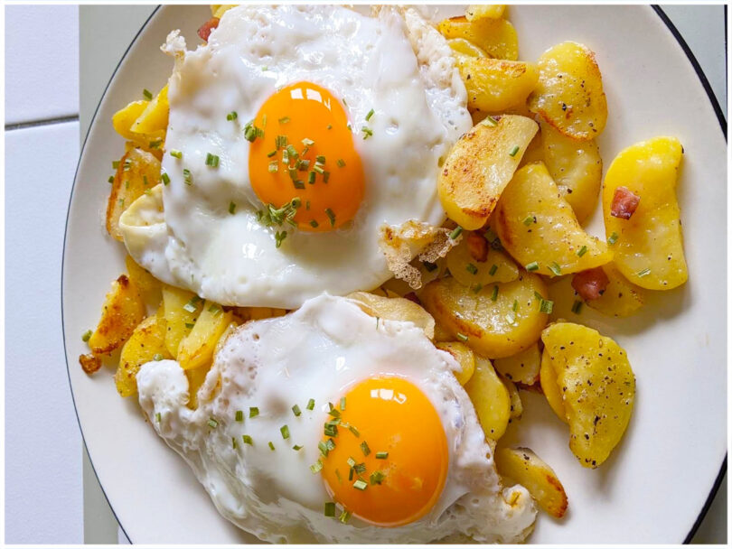 Dieses Rezept ist schnell und einfach zuzubereiten. Kartoffelpfanne mit Spiegelei ist ideal für jede Mahlzeit und schmeckt besonders gut mit einem einfachen Blattsalat mit Zitronendressing.