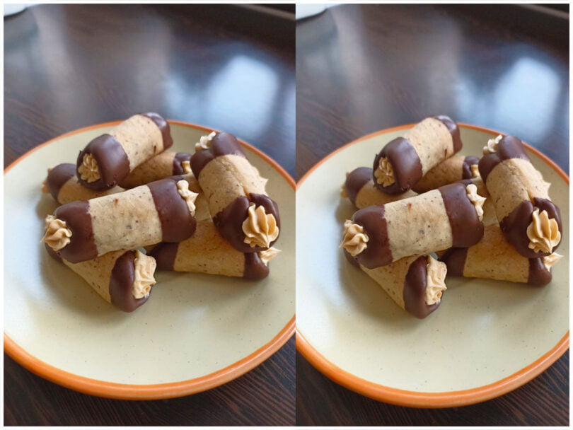 Die Röhrchen noch heiß vom Blech nehmen und abkühlen lassen. Die Enden in geschmolzene Schokolade tauchen und trocknen lassen.
