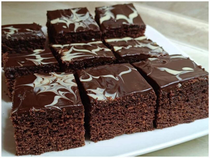 - Ganache fest werden lassen, Kuchen in Quadrate schneiden und servieren.