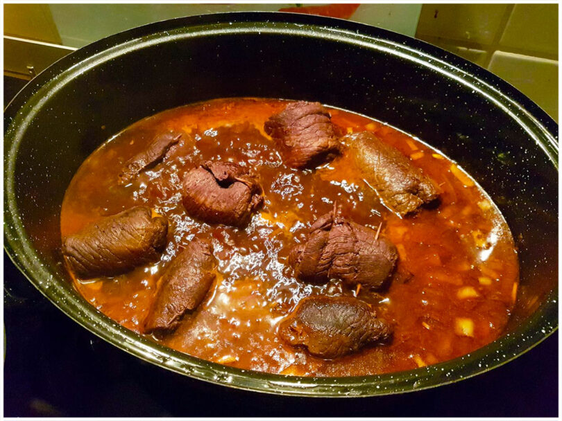 - Die Rouladen zurück in den Bräter geben, zum Kochen bringen. Zugedeckt bei schwacher Hitze 1,5 bis 2 Stunden schmoren, bis das Fleisch zart ist.